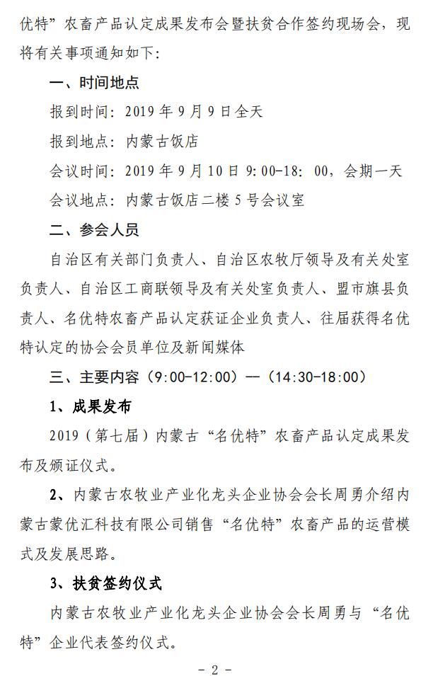 標題:關(guān)于召開 2019(第七屆)內(nèi)蒙古“名優(yōu)特” 農(nóng)畜產(chǎn)品認定成果發(fā)布會暨扶貧合作簽約 現(xiàn)場會的通知