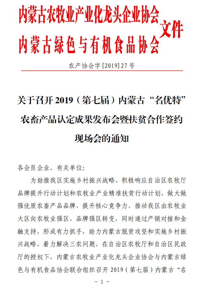 關(guān)于召開2019(第七屆)內(nèi)蒙古“名優(yōu)特”農(nóng)畜產(chǎn)品認定成果發(fā)布會暨扶貧合作簽約現(xiàn)場會的通知