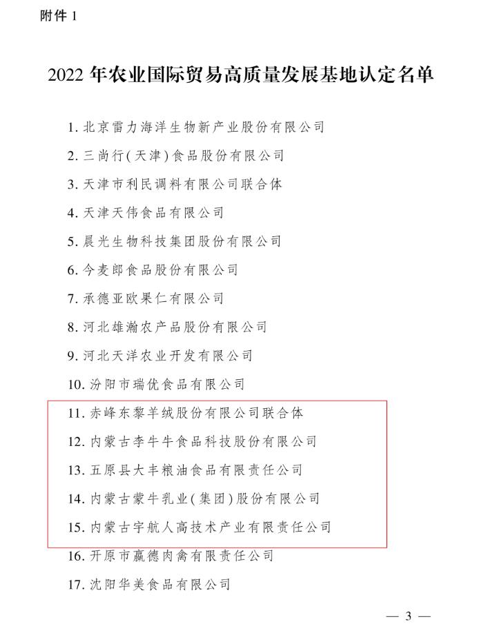8月29日,農(nóng)業(yè)農(nóng)村部辦公廳印發(fā)《關(guān)于認(rèn)定2022年農(nóng)業(yè)國(guó)際貿(mào)易高質(zhì)量發(fā)展基地的通知》,認(rèn)定116個(gè)基地為2022年農(nóng)業(yè)國(guó)際貿(mào)易高質(zhì)量發(fā)展基地,其中,內(nèi)蒙古5家企業(yè)上榜。