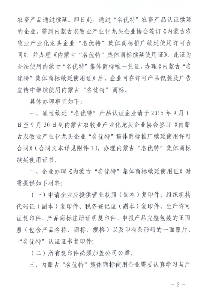 關(guān)于辦理《內(nèi)蒙古“名優(yōu)特”集體商標(biāo)續(xù)延使用證》通知