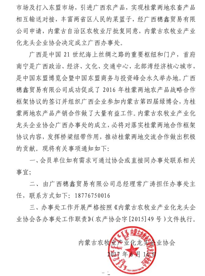 關(guān)于成立內(nèi)蒙古農(nóng)牧業(yè)產(chǎn)業(yè)化龍頭企業(yè)協(xié)會廣西辦事處的通知