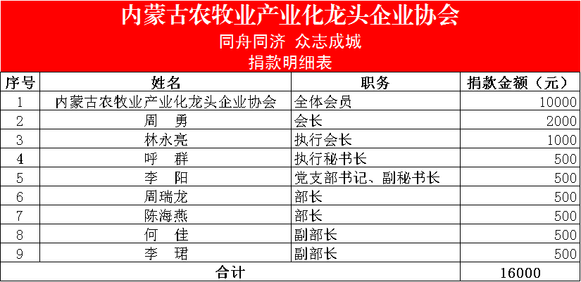三、“一方有難,八方支援”,截止目前,在協(xié)會(huì)會(huì)長(zhǎng)周勇的帶領(lǐng)下,協(xié)會(huì)秘書(shū)處共募集抗疫捐款1.6萬(wàn)元,結(jié)合地方所需,已于2月23日以現(xiàn)款形式捐贈(zèng)給呼和浩特市紅十字會(huì),用于呼和浩特市疫情防控工作。