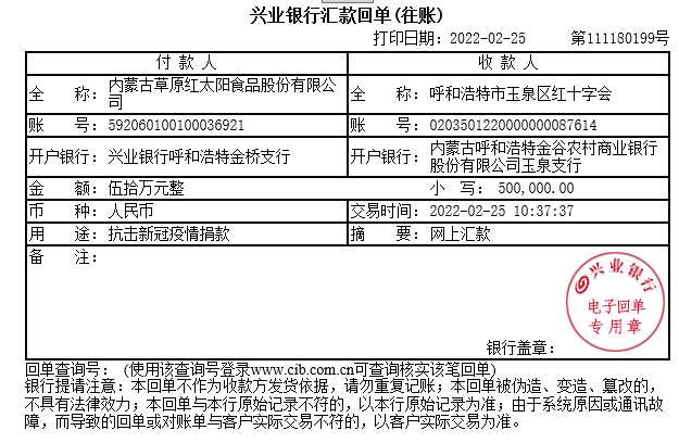 18、會(huì)員單位-內(nèi)蒙古草原紅太陽(yáng)食品股份有限公司:2022年2月25日,紅太陽(yáng)公司向呼和浩特市紅十字會(huì)捐款50萬(wàn)元,用于抗擊新冠疫情。