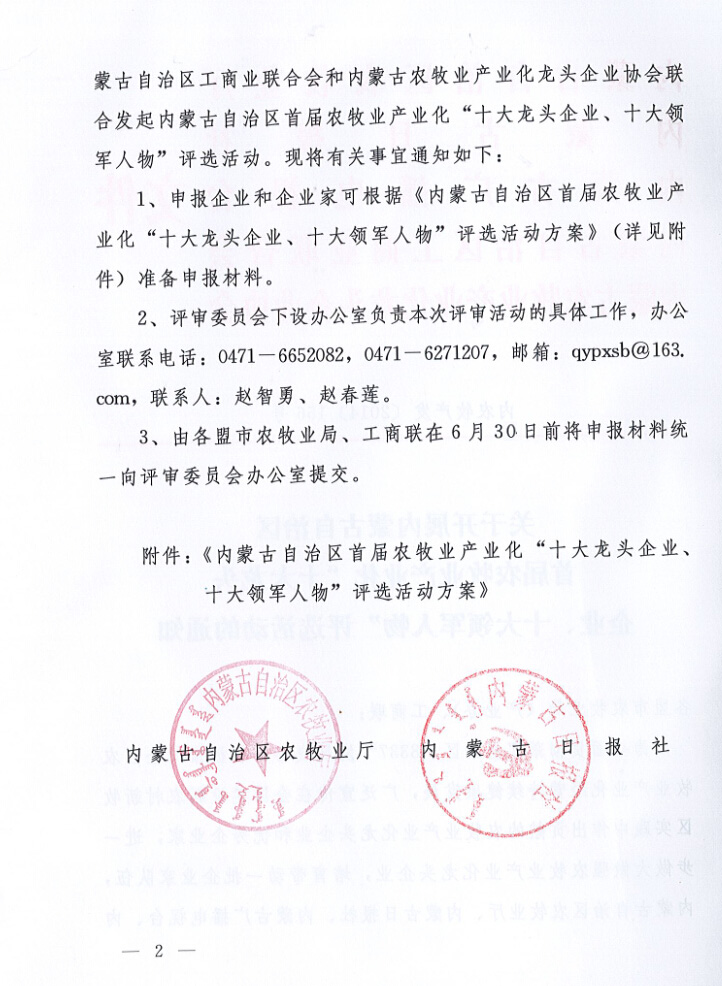 關(guān)于開(kāi)展內(nèi)蒙古自治區(qū)首屆農(nóng)牧業(yè)產(chǎn)業(yè)化“十大龍頭企業(yè)、十大領(lǐng)軍人物”評(píng)選活動(dòng)的通知