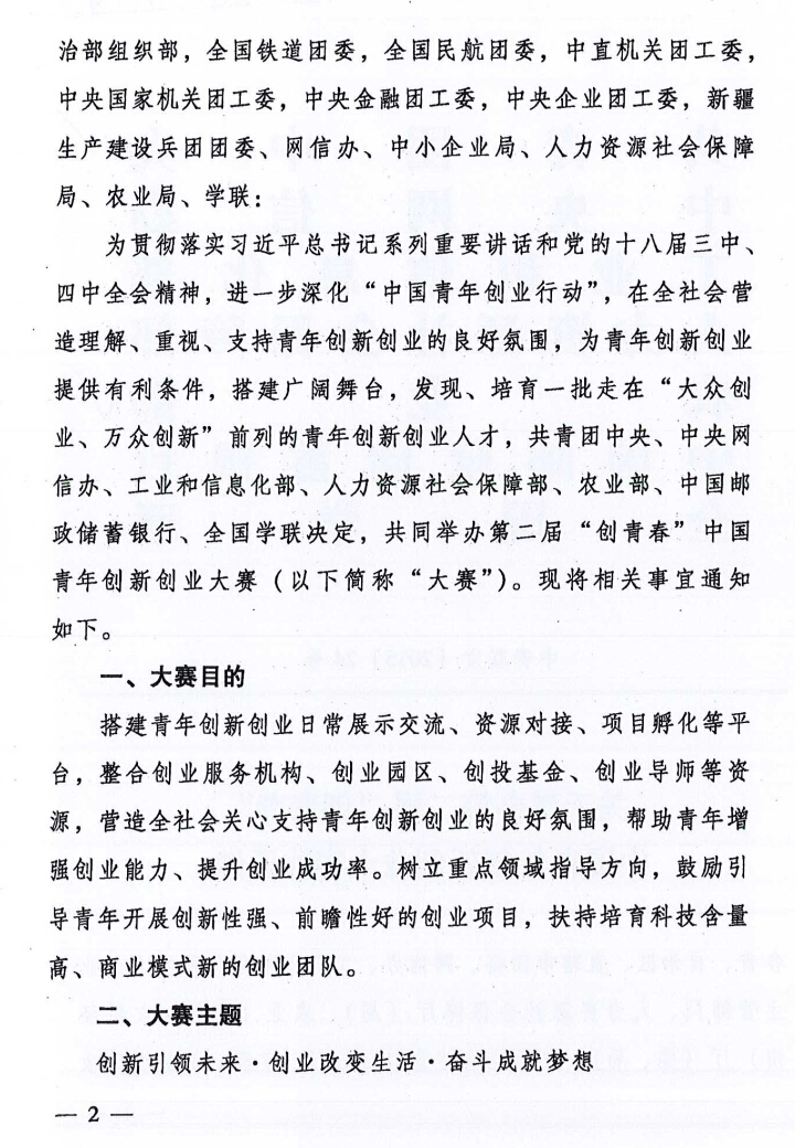 關(guān)于舉辦第二屆“創(chuàng)青春”中國青年創(chuàng)新創(chuàng)業(yè)大賽的通知