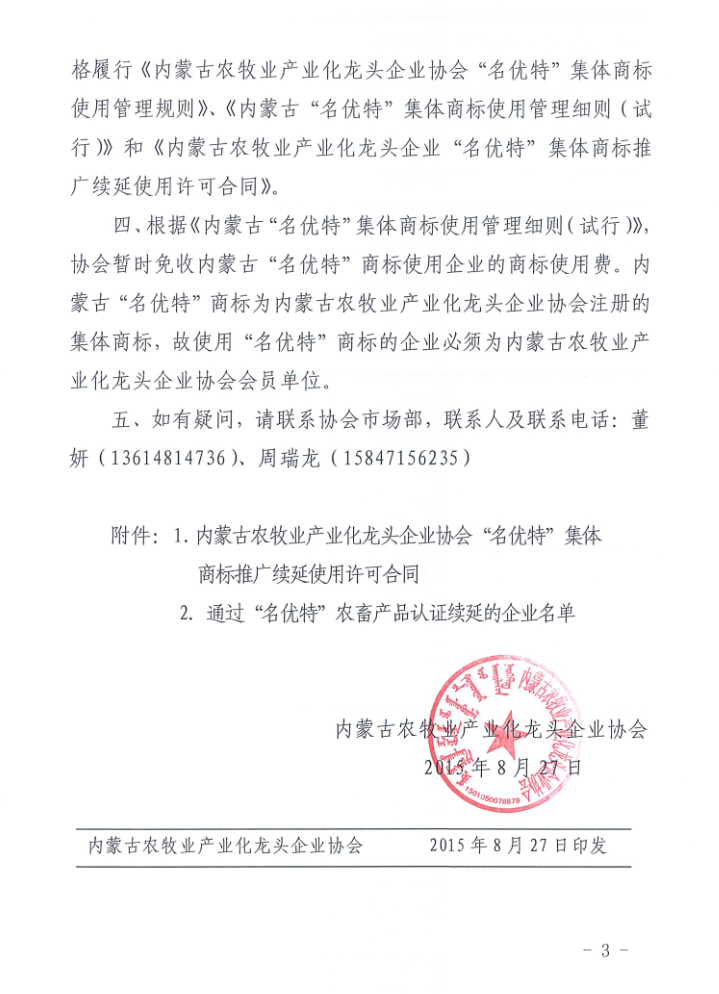 關(guān)于辦理《內(nèi)蒙古“名優(yōu)特”集體商標(biāo)續(xù)延使用證》通知