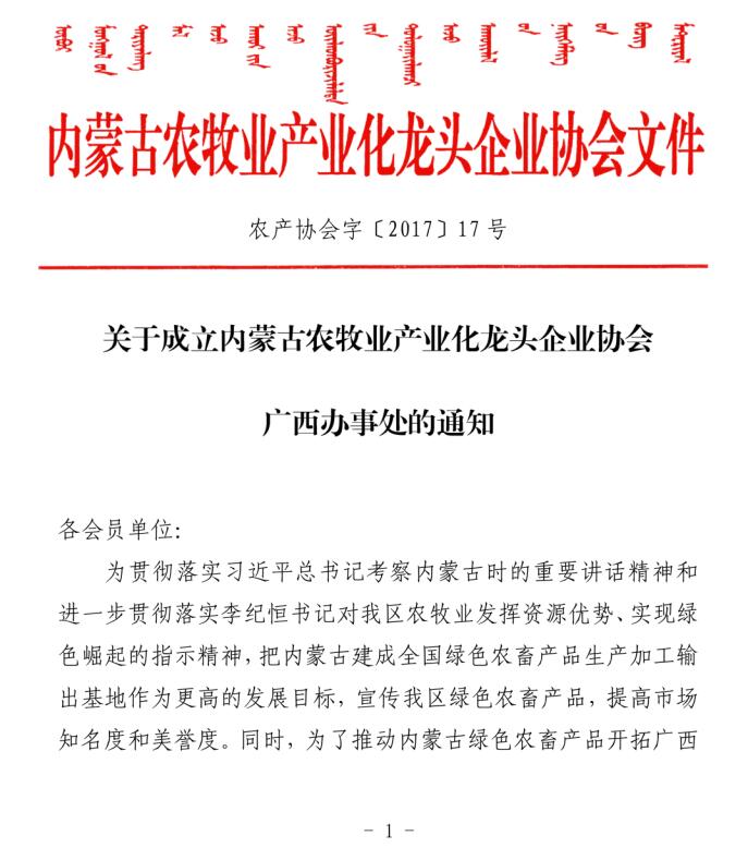 關(guān)于成立內(nèi)蒙古農(nóng)牧業(yè)產(chǎn)業(yè)化龍頭企業(yè)協(xié)會廣西辦事處的通知